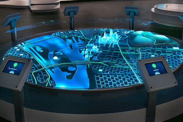 交互功能:參觀者可以通過觸摸屏選擇不同的規(guī)劃方案,查看其對(duì)城市的影響。